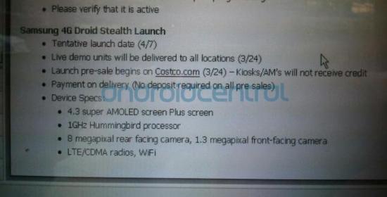 Costco is informing its employees that they are planning to launch the Samsung 4G Droid Stealth around 4/7 and that a pre-sale will start for the device on 3/24 (this Thursday). Couple of things to note here. This device will definitely be DROID branded at launch, which is a little odd and something I’ve been trying to wrap my head around for a couple of weeks now. One of my most trusted sources hit me up with this news and is the reason I kept saying there would be a “surprise attached” to it, so this is exactly the public confirmation that I was hoping to see. We can now start talking about it!