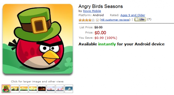 Here is your chance to put a stop to that awful lag that’s experienced whenever you play Angry Birds Seasons and an advertisement pops up. The ad-free version is…FREE, today through the Amazon appstore! And just so you know, this will replace your currently installed ad-blasted version, but will not overwrite any settings or gameplay. After installing, you’ll be right where you left off.
