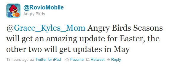 Oh and if you were wondering about Angry Birds Rio or the regular edition, they’ll be seeing updates some time in May. So yeah, no slowage of flying birds any time soon.