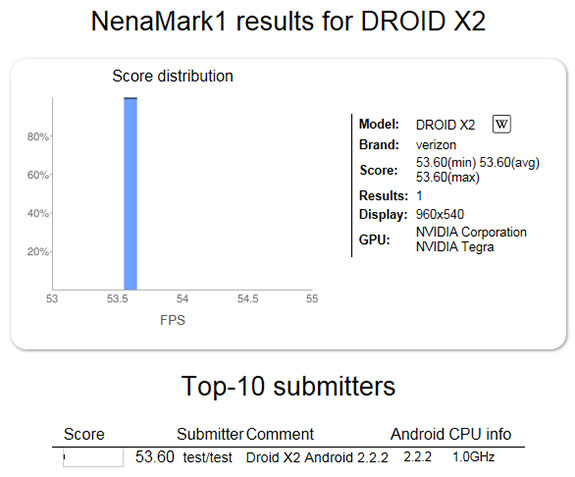The DROIDX2 appears to have been benchmarked over at Nenamark recently, possibly confirming that it will have a Tegra 2 dual-core processor, which is news we first reported on back in January. It is also showing up with a screen resolution of 960×540 which would suggest that it will have the same qHD screen that will accompany the DROID BIONIC and the rest of Motorola’s new high-end devices. This is good news for a device that was really just looking like a small re-hash of last year’s uber successful original DROIDX.