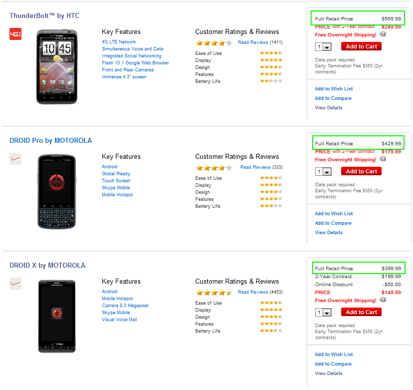 There has been a lot of not-so-happy talk over the last week about Verizon and the elimination of 1-year contracts from new customers or from those that are renewing, but after glancing around their site for a few minutes today, things may not be so bad after all. Check out the screenshot above that was taken within the last few minutes from Big Red’s site and tell me you aren’t excited about those full retail prices. A DROIDX for $399? DROID Pro for $429? How about the brand new HTC Thunderbolt for $569? While we’re sad to see 1-year contracts go, this appears to be a great sign for those of us that refuse to sign contracts at all. We’ll be digging around our VZW contacts for more info.