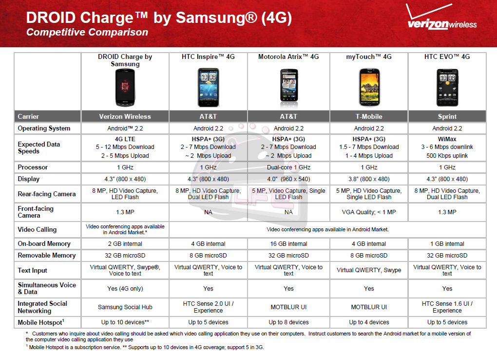 We broke news earlier on the DROID Charge having the ability to connect up to 10 devices through its mobile hotspot app, but we’re back with more. Been wondering how the device compares to the competition both inside and outside of Verizon? Above we have the battle between it and the Inspire 4G, Atrix 4G, myTouch 4G and EVO 4G. And below, we have the Charge compared to other Big Red devices like the Thunderbolt, Fascinate, DROID 2 Global and i*hone 4.
