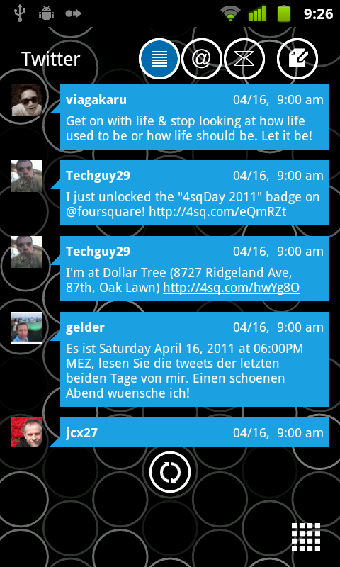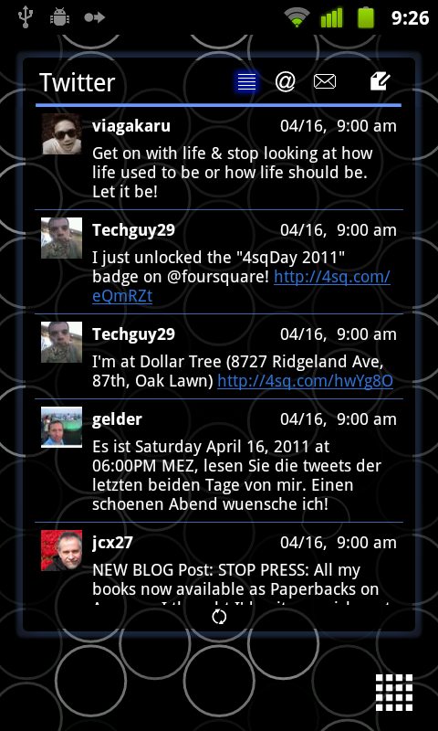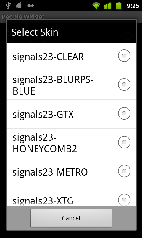 For those of you new to “skinning,” here are a few tips. You will need to have LauncherPro Plus, which now has an unlocker in the market. From there, you download skins of your choice which can be found at the signals23 link above. After downloading, navigate to Preferences>LP Widget Settings and then tap on the widget of choice. You will then see an option to “Select Skin” which gives you a drop down of the skins you have installed. Choose one, back out to your home screen and add that widget.