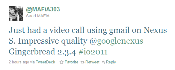 And I realize that the tweet above talks of video calling “using Gmail”, but we’re going to assume he meant Google Talk. Building a video chatting feature into Gmail makes zero sense especially when its GTalk brother already has it. Also, if this tweet above is to be believed, the next version of Android to touch the Nexus S will be version 2.3.4. And now you know why I bought that pretty little white one.