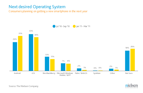 Android phones have now become the cool thing to have according to the latest 2011 numbers out of Nielsen. After surveying a number of people from January-March of this year, the numbers show that 31% of future smartphone owners plan to buy one running Android, which slips past the iPhone (30%) for the first time. They also found that 50% of recent smartphone acquirers purchased Android phones, with iOS devices coming in at only 25% and in second. And of course, Android maintained its grasp on the overall market share, controlling 37% of it.