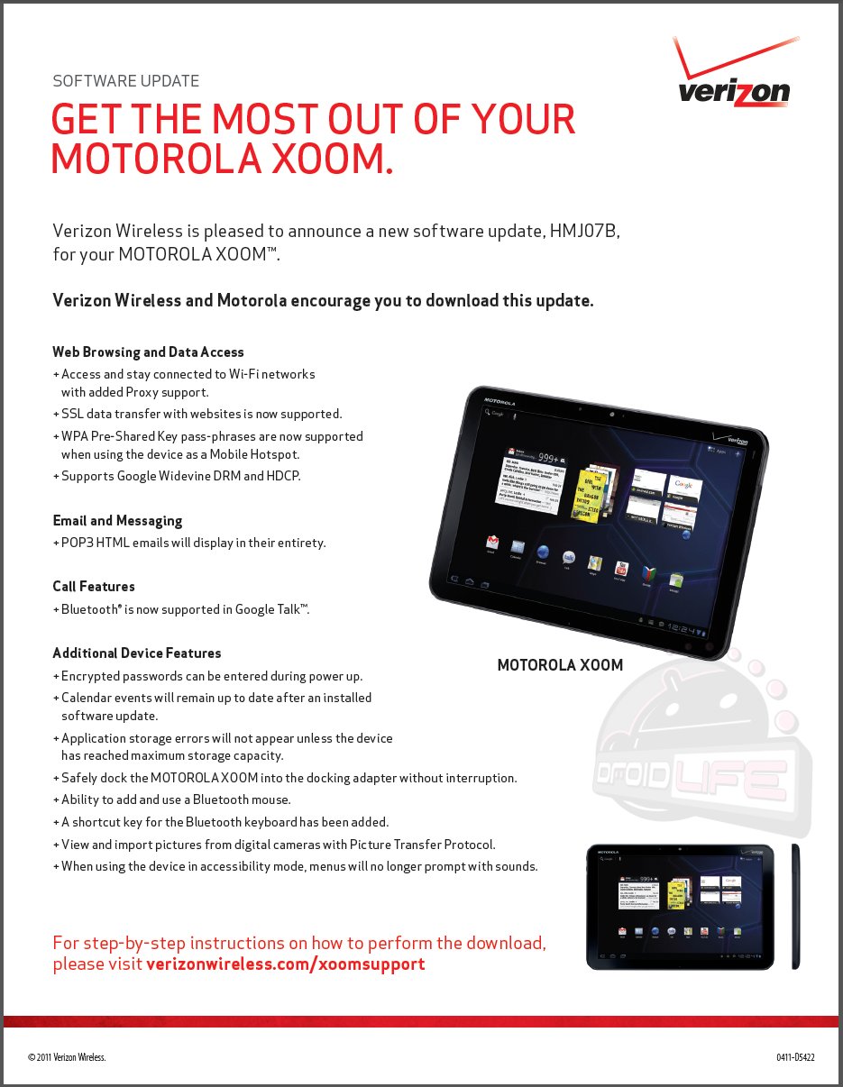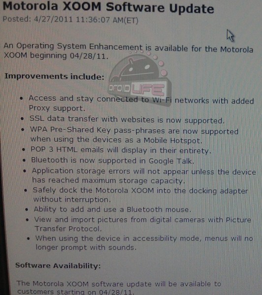 A Motorola XOOM update will be made available tomorrow that brings a bunch of fixes to the device including Bluetooth support on Google Talk and for a mouse, proxy support, and a new picture transfer protocol. Check out additional details after the break. Oh, and no, this does not include a fix for SD card support. You still have to root and flash a new kernel to get that action.