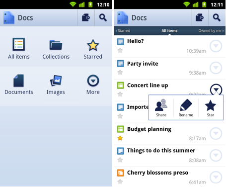 Yes! Google Docs for Android has finally arrived and it’s looking feature packed. You can now access your G-Docs from anywhere and from any account, share items with contacts, upload docs from phone, open through Gmail, and even perform a variety of functions through a new widget.