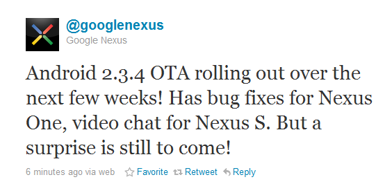 Well, here is one surprise, although according to @GoogleNexus, there is still another one to come later today. Android 2.3.4 will begin rolling out over the next few weeks to Nexus S and One devices, bringing Google Talk with Video and some other fixes. Yessir. This update will allow you to have video chats with friends over 3G, 4G and Wi-Fi and between friends on tablets, phones and in Gmail. Check out the video and pics of this new video chatting GTalk after the jump.