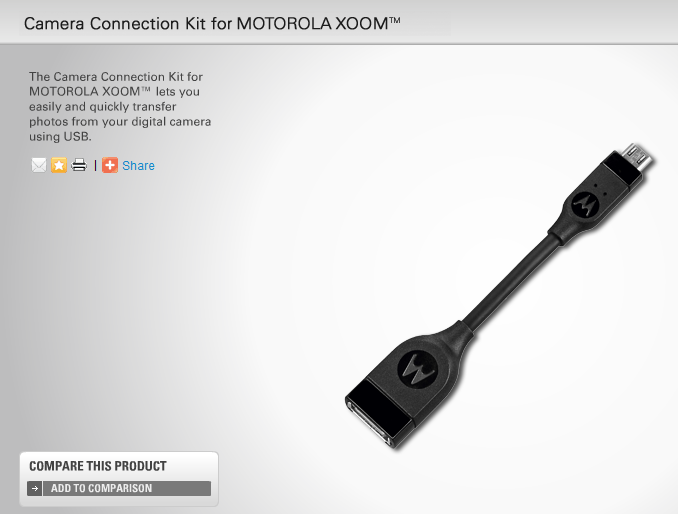 When we first reported yesterday that a Motorola XOOM update would be made available today, we were sort of confused about one of the new enhancements included in it – the new “picture transfer protocol.” We kept wondering how this was going to work, but the answer is now obvious thanks to a couple of tips from some VZW friends. Motorola is introducing a XOOM Camera Kit that is available for $19.99 and can be ordered if you ask a Verizon rep to use item#: MOTMZ600ADPKIT. We say to ask a rep because the accessory is not yet viewable online, but we’re being told that it’s definitely in stock and can be ordered.