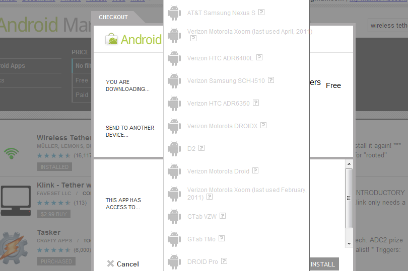 If you aren’t sure what that picture is saying, let me attempt to break it down for you. After receiving a tip that Verizon may be blocking Wireless Tether from the market, I decided to do a little digging on the variety of devices I own. Sure enough, from all of my phones, including the Nexus S I have running on AT&T, I was unable to find Wireless Tether in the market. So to see what was really going on, I jumped into the browser-based Android Market to see if I could find the app and definitely did. But what you are seeing, is my list of devices, all of which cannot accept this app.