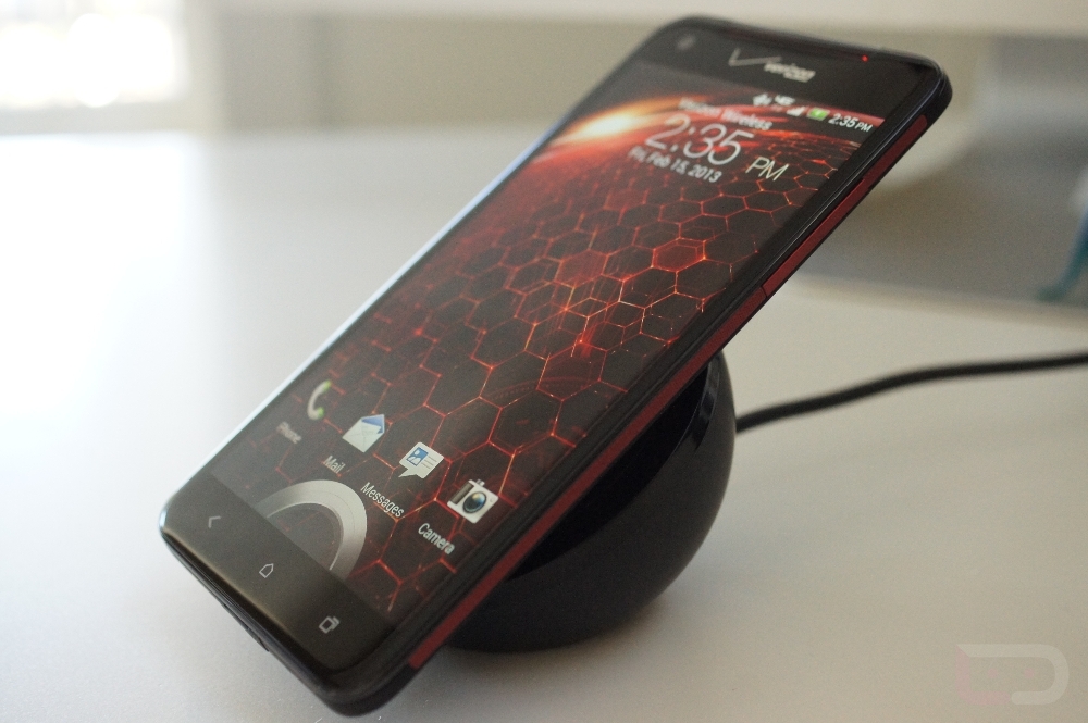 The Nexus 4 wireless charger is built to the Qi wireless charging standard, so yep, it works with other devices. I’ve got the DROID DNA attached to it as I type this and it seems to be charging just fine. The sticky rubberized face is also holding onto the device quite well. Here is a picture of the DROID DNA on it.