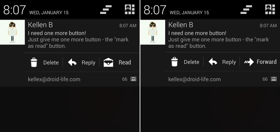 Each morning, I wake up to the alarm on my phone, pick it up after snoozing it a couple of times, and then immediately swipe down the notification bar to see what kind of mess is going on in my three Gmail inboxes. Since there are typically dozens awaiting action, the notification preview forces me to enter the inbox to deal with them. But once I’ve done that, the notifications continue to pop up throughout the day (some times before I get out of bed), one at a time, with actionable buttons for “reply” or “delete.” These button additions by the Android team to notifications have been game-changing, if you ask me. Being able to instantly react to an email that comes through your inbox is something I could not live without now that I have experienced it.