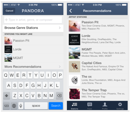 The recommendations – up to 6 artist stations to add or listen to at a time– are determined based on current listening preference, song likes and dislikes, and your station list. As has always been the case with Pandora, the more you engage with the product, the more it will learn your musical preferences and be able to further optimize the station recommendations. They can be found both at the “create a station” screen and at the bottom of your station list. Also, your station recommendation list is refreshed when a new station is created or deleted.