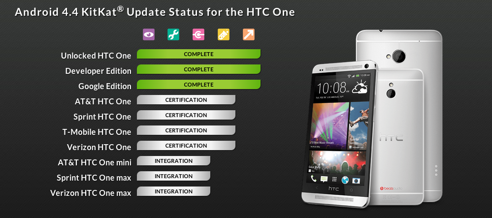 According to HTC’s roadmap for software updates, the Android 4.4 “Kit Kat” update for the One on Verizon, AT&T, Sprint, and T-Mobile has now reached what they have dubbed the “certification” stage. In other words, we are getting closer to a release now that HTC is giving this initial build a last look before carriers take a crack at it.