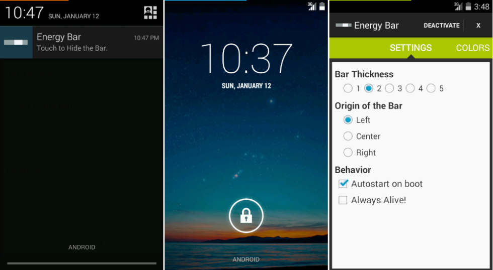 If you have ever ran a custom ROM on your Android device, then you may have seen a nifty little feature that would allow you to place a battery bar along the top of your device’s display. The bar’s color could change depending on how much charge you had left, and it was just a nice little aesthetic change you could perform to switch up the look of your device. Well, that same bar is now available for all users without root on Google Play, and it is called Energy Bar.