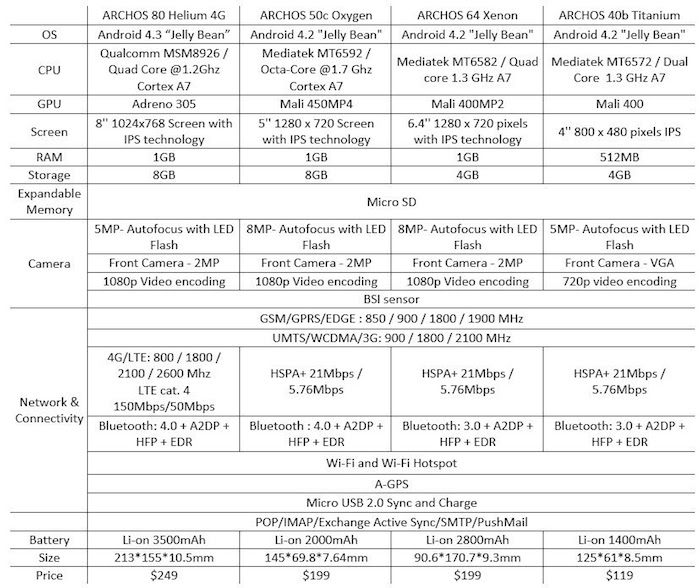 Ahead of MWC next week, ARCHOS announced four new devices that they will have on display, three phones and one tablet. There is the 80 Helium 4G (the tablet), the 50c Oxygen, 64 Xenon, and the 40b Titanium. Without being too prejudice, this is ARCHOS we are talking about, so you can expect the price to be low and specs to fit inside a budget.
