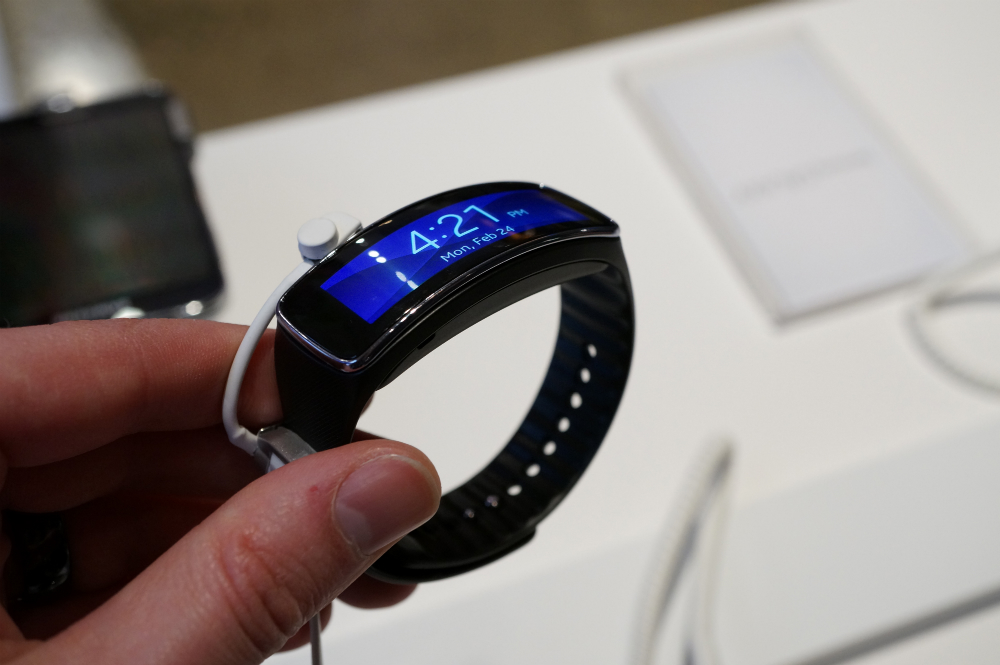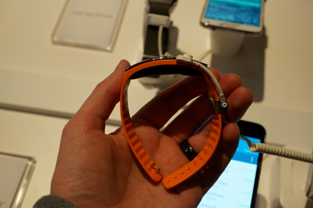 Outside of the Galaxy S5, our Samsung event was filled with people buzzing about the Gear Fit, Samsung’s new fitness tracker that has a curved AMOLED display. I’m still trying to wrap my brain around its design, but if anything, it has my attention.
