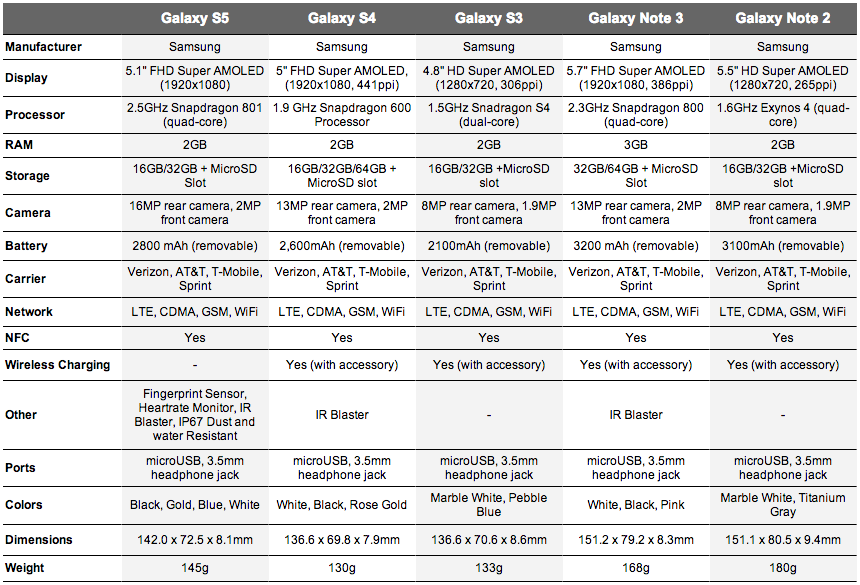 So we’ve taken the Galaxy S5 and put it up against the Galaxy S4, Galaxy S3, Galaxy Note 3 and Galaxy Note 2. This is as simple of a comparison as it gets, but it also shows what has changed and what hasn’t. I think it’s clear that Samsung gave us much of the same, but tried to show they can innovate in new areas, like with sensors, rather than with a QHD display.