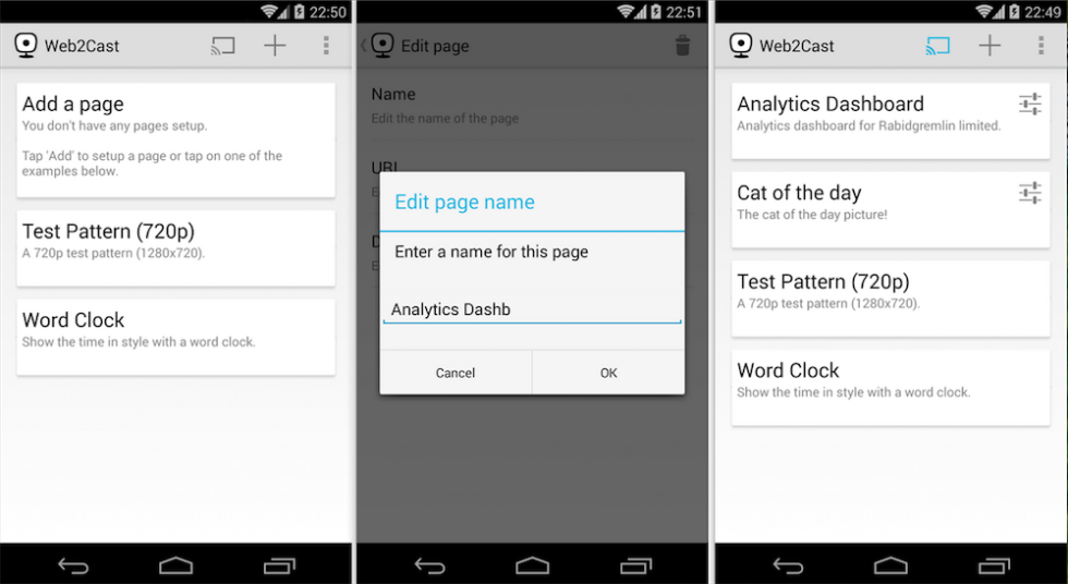 You can add a webpage using the app’s interface and give it a name to recognize it by, and then tap on it to send it over to your Chromecast. HTML files and many types of images are supported, so you won’t have trouble finding content to place on your TV.