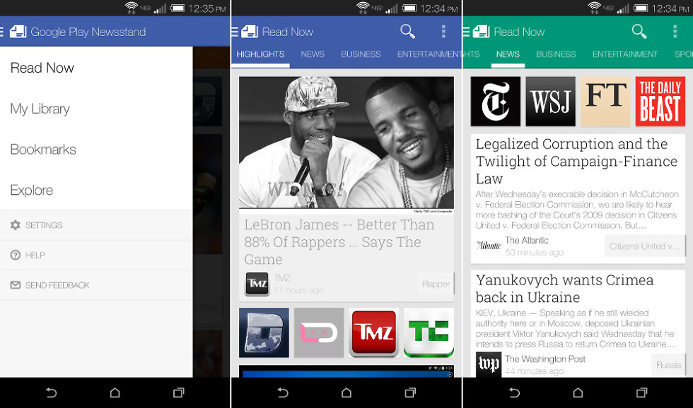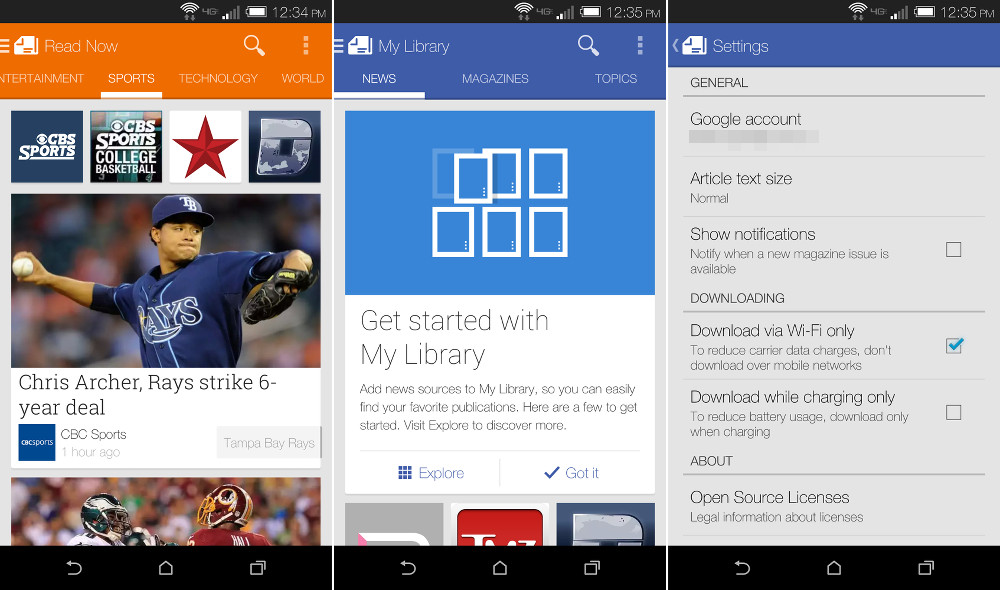 In the update, which jumps us up to v3.2.0, we’re seeing a re-organized app in terms of layout and sections. From the main “Read Now” tab, you’ll see topics strung across the top for Highlights, News, Business, Entertainment, Sports, Technology, and so on. A swipe to the right or left will jump you in between them quickly. In the navigation menu, the My News and My Magazines sections have been combined into a My Library tab. We’re also seeing the “Keep Read Now on device” option missing, which was a way for you to store that section on your device for offline reading. Maybe the app is doing that automatically now? I would hope not.