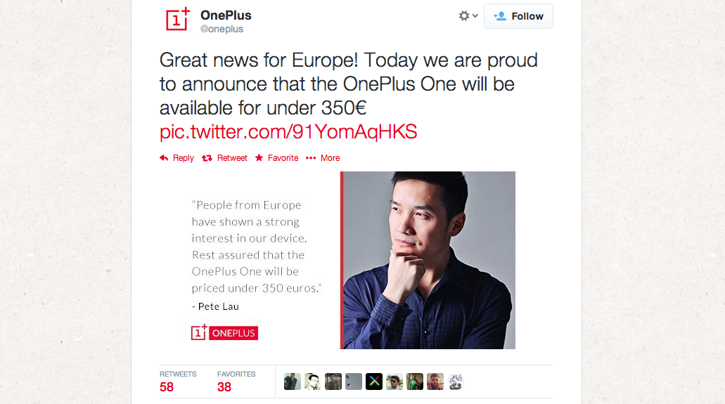In a quote that was then publicized on OnePlus’ Twitter account today, CEO Pete Lau said that the European market has shown good interest in the One. He apparently went on to say that they could expect a sub-350€ price point when the device eventually launches. That translates to about $480 for the unlocked, Cyanogen-powered smartphone.