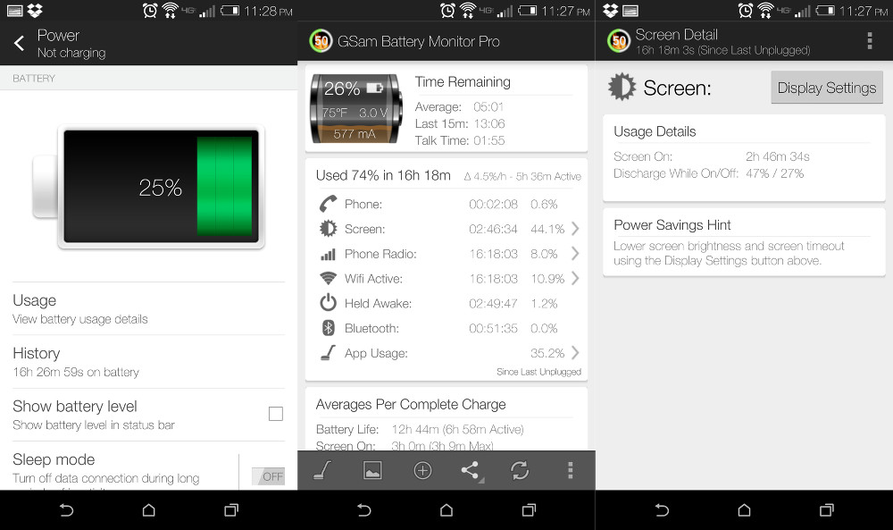 HTC claims that the new One (M8) could see upwards of 40% better battery life over last year’s M7, but I’m not sure I’m buying it. I saw average battery life in my testing on the 2,600mAh battery that wasn’t necessarily greatly improved over last year’s One. My testing typically includes multiple days in a row of nothing but 4G LTE, followed by a few with WiFi mixed in. On 4G LTE-only days, my phone was almost always begging for a charger after 10-12 hours of use and around 3 hours of screen-on time. That’s not terrible by any means, but also not game-changing. With WiFi enabled for longer periods of time, battery life extended well past the 16 hour mark, but that’s to be expected.