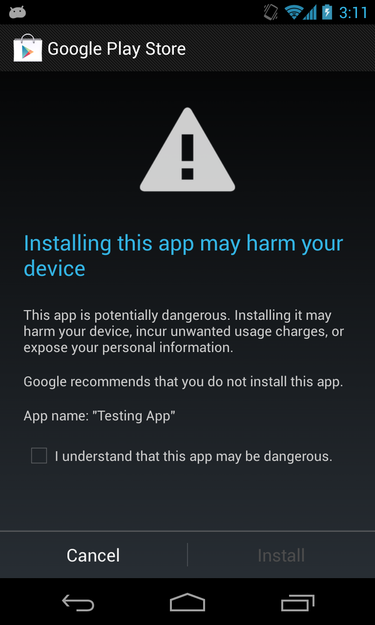 For those not familiar, we’re talking about the “Verify Apps” setting that is located in your Security settings. With this option enabled, your phone will warn you if you install an app that is being sideloaded or isn’t from Google Play. If Google decides that the app could be harmful, it will either tell you that it could be harmful or block installation.