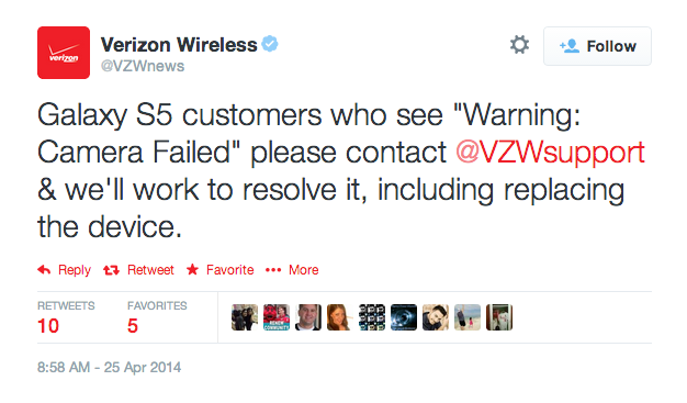 After a couple of days, Samsung and Verizon have reached out about the issue. Both companies clearly want to help their customers with the problem, and below we have posted their statements on the issue. Verizon tweeted out the following message below, letting owners of the Galaxy S5 know that if they are experiencing the issue, they will work to solve the problem, which includes replacing the device if need be.