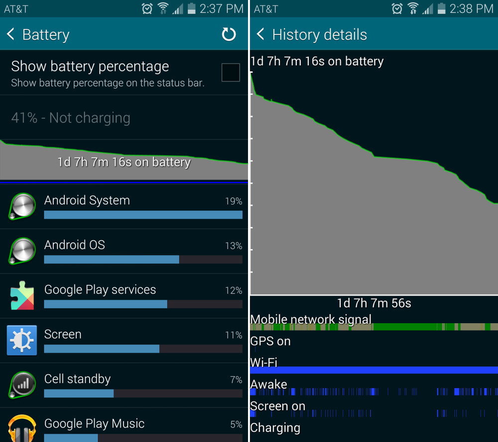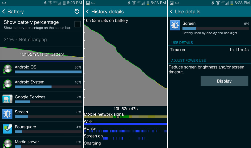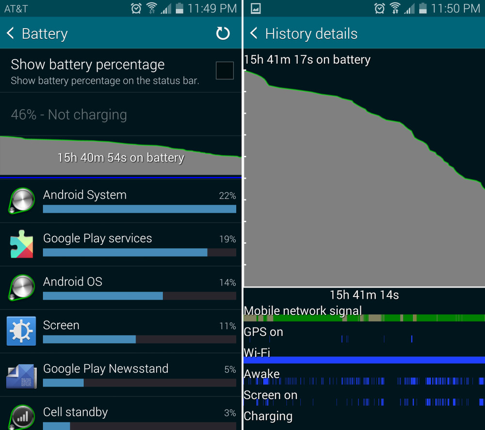 Kellen, on the other hand, had pretty terrible battery life to report, which can be seen in the two sets of screenshots on the right. It could be that Verizon doesn’t have great coverage in his area. As you can tell from his tests, his signal wasn’t green most of the time, so the battery life was likely suffering. Reports elsewhere tend to be more in line with my results, not Kellen’s. Battery life shouldn’t be something to worry about if you purchase the Galay S5. -T