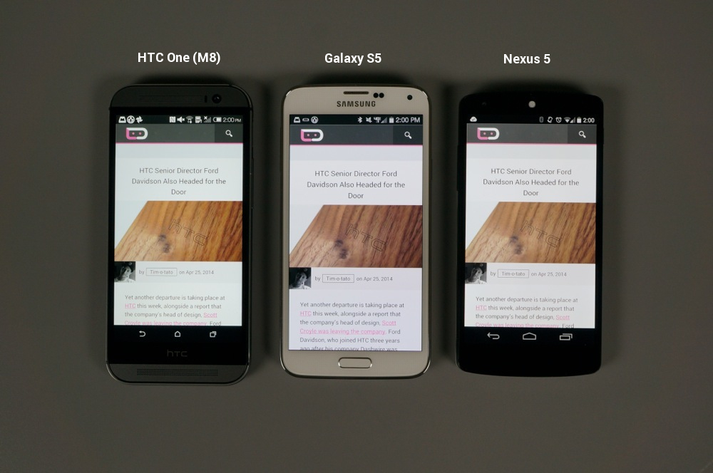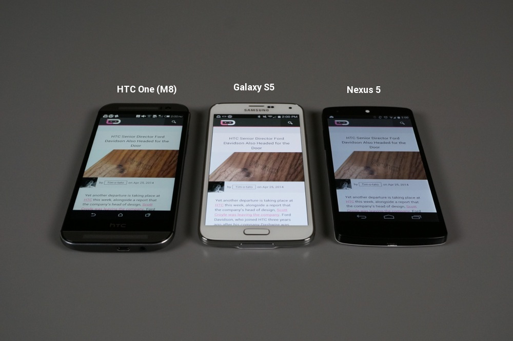 If you take a look at the comparisons (above-right) of the GS5 to the One (M8) and Nexus 5 at full brightness, you can see how much better the viewing angles hold on the Galaxy S5. When looking at all three from the top down, they all look mostly the same, but the tones on the GS5 come off a bit richer than the other two. My eyes tend to see LCD displays washing out colors, which to me is what we are seeing on the wood of the image on the LCDs of the N5 and M8, along with the grey top bar on the Droid Life home page.
