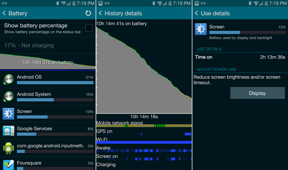While I personally was able to get a solid day out of the Galaxy S5 which included a normal day of work, errands, and late night grub runs (two sets of screenshots on the left). If I didn’t go anywhere throughout the day and then didn’t plug in the phone overnight, I could get a day and a half easily (mostly on WiFi). The battery life isn’t outstanding, not by any means, but it wasn’t bad either. It was just what you would expect from a device with a ton of features running in the background and top tier specs.
