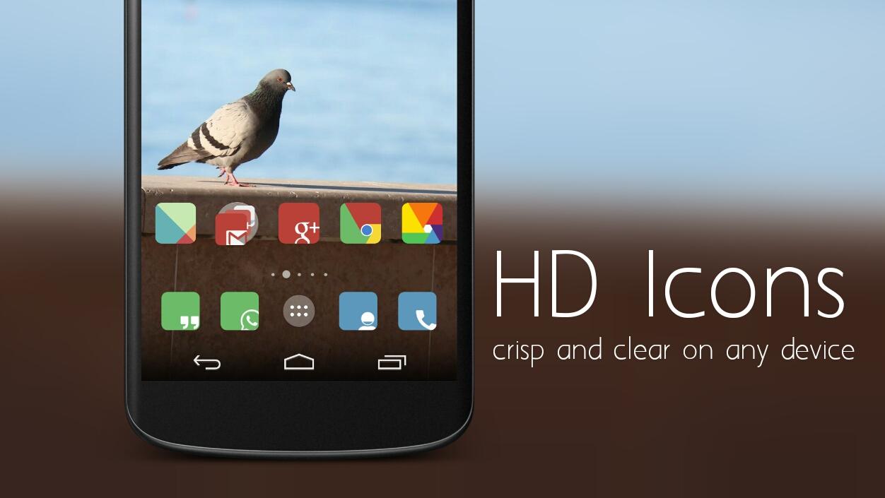 With over 1000 icons, YAFI looks to take the traditional flat icon look and add upon it with extra features. Icons are easily recognizable because of the clever color palette, too. YAFI comes with 24 white dock icons, an analog clock widget, and wlpapR integration as well, in case you want the most bang for your buck. YAFI costs $2.08 to download over at Google Play