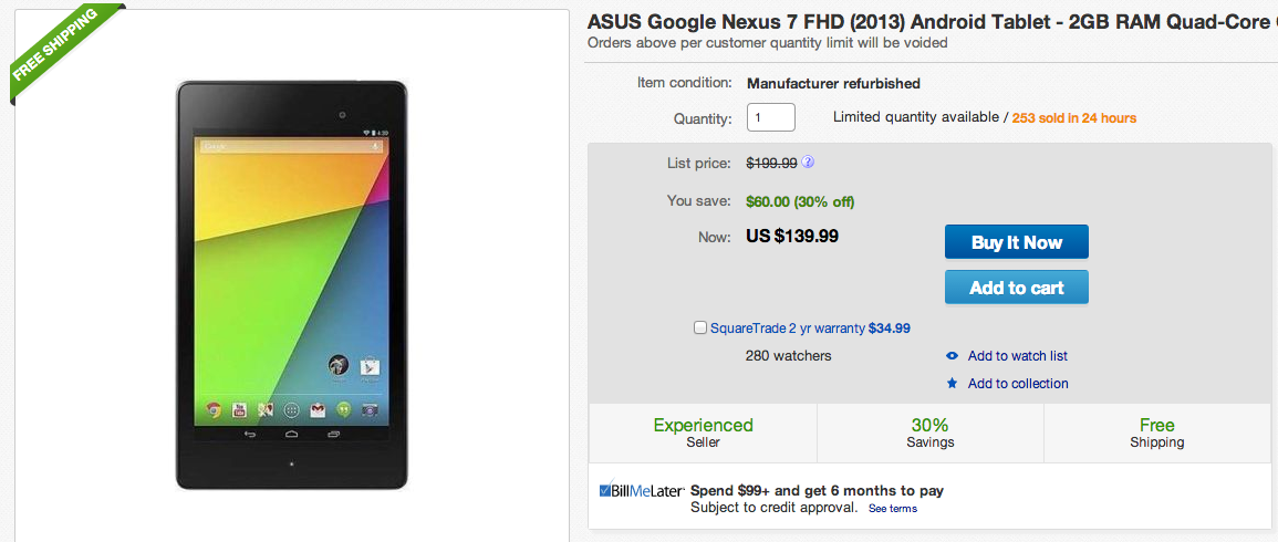 The 16GB version through Google Play still current retails for $229. Do the words “manufacturer refurbished” scare you enough to give up a $90 discount?