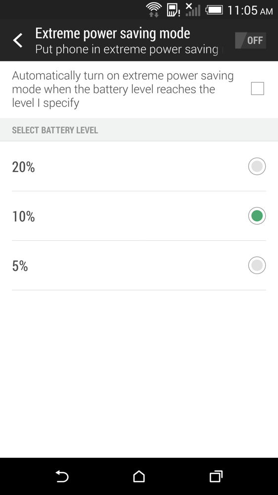 For those new to Extreme Power Saving Mode, think of it like Samsung’s Ultra Power Saving Mode on the Galaxy S5. The point of the feature is to extend your battery life when you need to the most. If you are in a situation where charging isn’t an option, but you need juice extended out for an extra couple of hours, battery saving modes can turn off juice guzzlers to keep you moving. It leaves only the essentials running, which HTC claims can give you up to an extra 24 hours of life.
