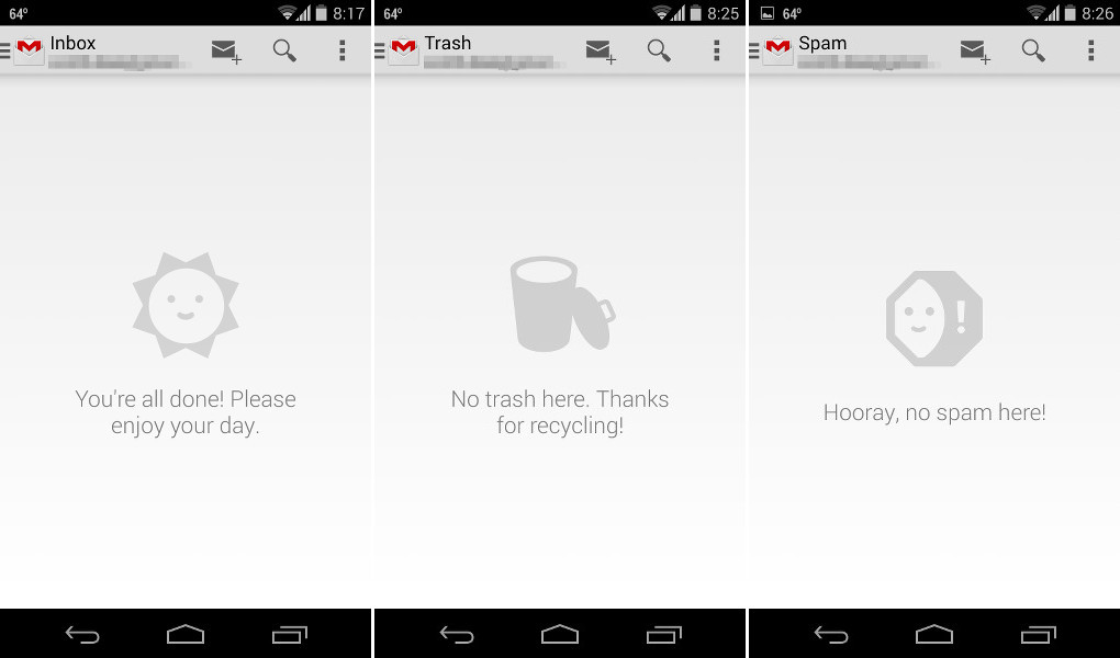 Update: Friend of the site, Scott, said that this screen is also new. You are looking at an empty inbox, with Google telling you to go enjoy your day. The exact wording is, “You’re all done! Please enjoy your day.” This is somewhat of a play on Mailbox’s inbox zero. Who knows if Google will ever take it further than this, though. Still, a nice touch to let you know that you have done a good job.