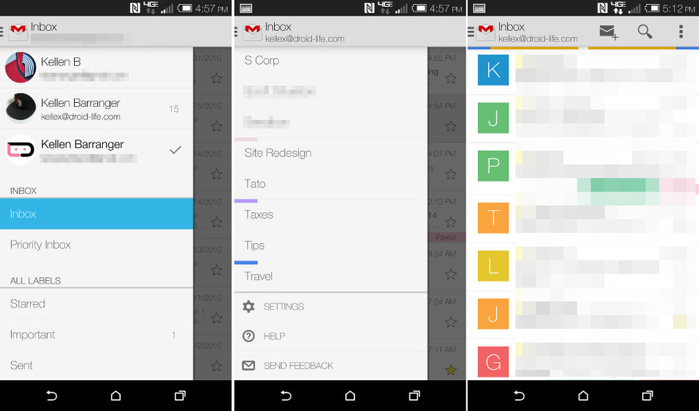 We are now seeing profile images next to individual Gmail accounts should you have more than one, along with a check mark that shows which account you are currently using. Google also pushed the Settings and “Send Feedback” options down into the hamburger menu, a move that has become somewhat of a standard for Google apps as of late. They previously took up space in the action overflow menu, up in the top right corner. The pull-to-refresh animation is now full-Google-color, instead of the thin blue animation previously included.