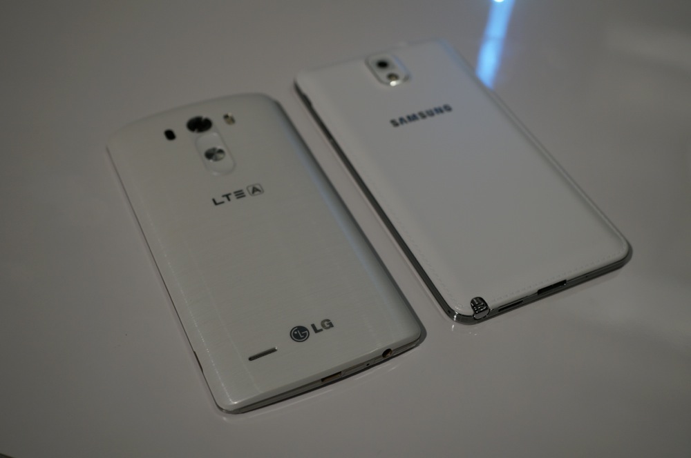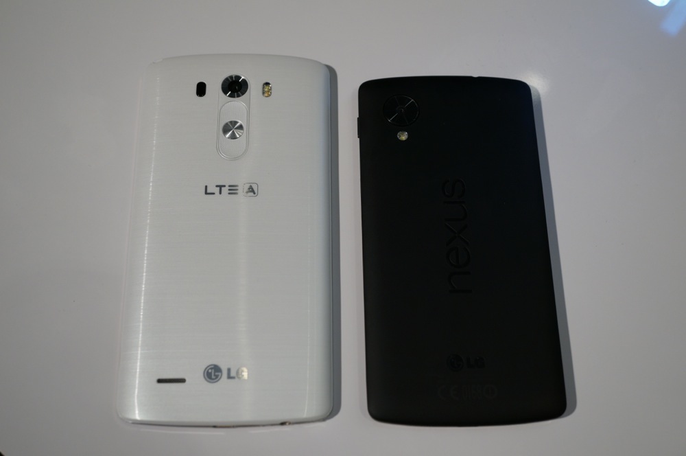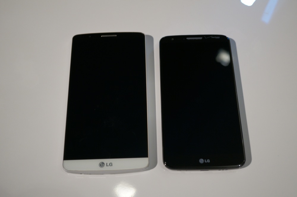 After running through a quick overview and tour with the LG G3, here at one of the satellite press events, we also took a couple of minutes to compare the size of the device to most of the flagships currently available. We somehow forgot to compare the G3 to the HTC One (M8), but did put it side-by-side with the LG G2, Samsung Galaxy S5 and Galaxy Note 3, and Nexus 5.