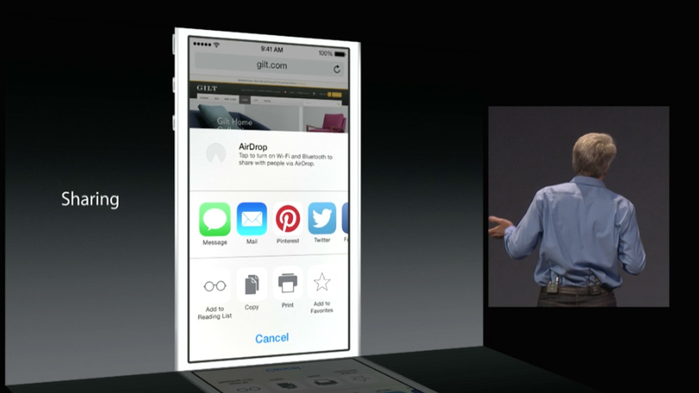 With sharing, that means that Dropbox or Box or Pinterest or a non-official Twitter app could build in the ability to share directly from an app. In the past, Apple only allowed specific apps to have this power, like the official Twitter app. But with this new 3rd party sharing extension, almost any developer can add in sharing. So on Android, how since the dawn of time, you were able to share things with any Twitter app you choose or to Instagram or to another browser or to WhatsApp, you will soon be able to do the same on iOS.