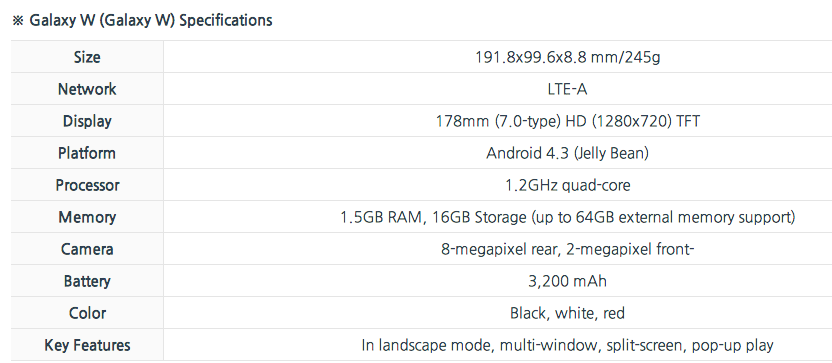 Samsung announced a new smartphone over the weekend, the Galaxy W. The “W” should stand for “WTF,” as the Galaxy W comes packed with a display size of 7″ at a resolution of 1280 x 720. Imagine holding that device up to your head for placing calls. It would seem rather silly to anyone witnessing such a sight.