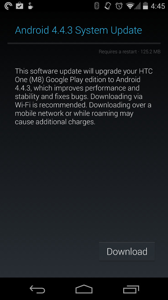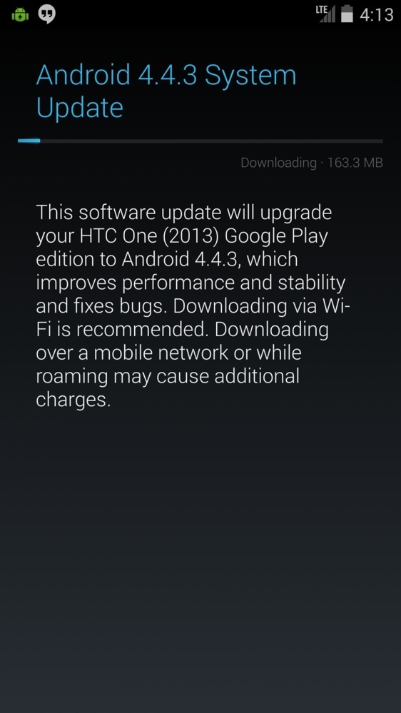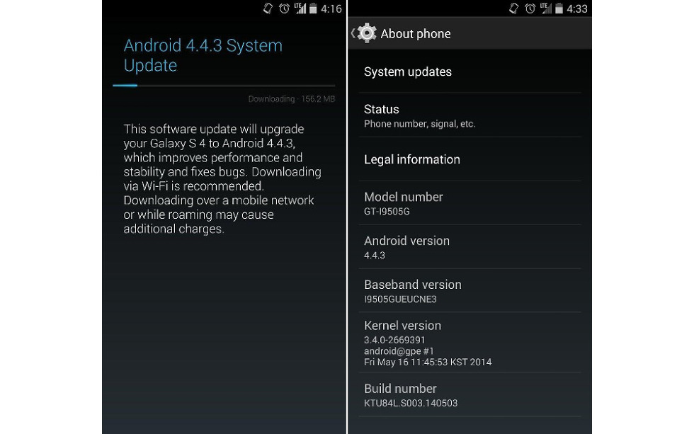 According to at least one proud owner of the Samsung Galaxy S4 Google Play Edition, Google has already started rolling out Android 4.4.3 to the device. As you can see in both screenshots above, the update weighs in at a solid 156.2MB.