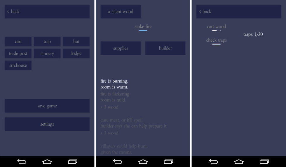 In the game, you are in the woods, alone in the dark. Quickly, you light a fire, encounter new folks, and build up your own little establishment. While at times it is hard to understand what to do, the story is quite intriguing. To start off, your main goal is to collect fire wood (to keep your fire going), build carts and traps for food, and meet new people who can help you.