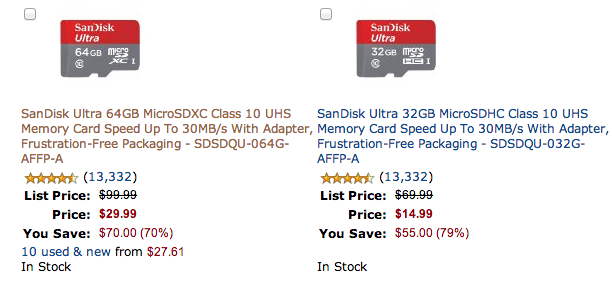 Amazon is hosting one of their most commonly seen deals today, one for SanDisk memory with prices slashed by as much as 70%. You will find Ultra (speeds up to 30MB/s) micro SD cards with 32GB limits for as little as $14.99. They also have 64GB Ultra micro SD cards for $29.99. If you want similar amounts of storage but faster speeds, we are talking the Extreme line (speeds up to 45MB/s) which comes in 32GB and 64GB sizes as well, with prices running $20.99 and $44.99, respectively.