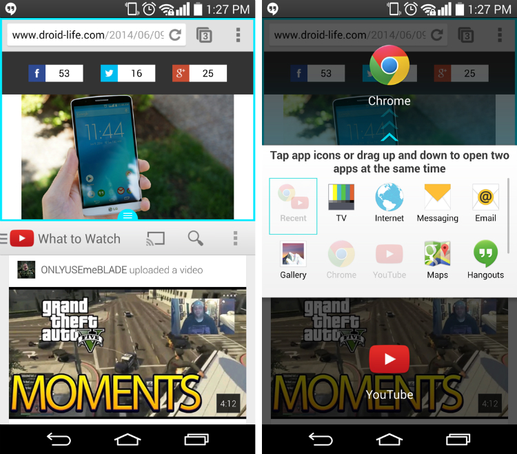 This means that when you are browsing the web on Chrome, you can also catch up on the latest YouTube videos or posts on Droid Life in a window above or below Chrome. Awesome, right?