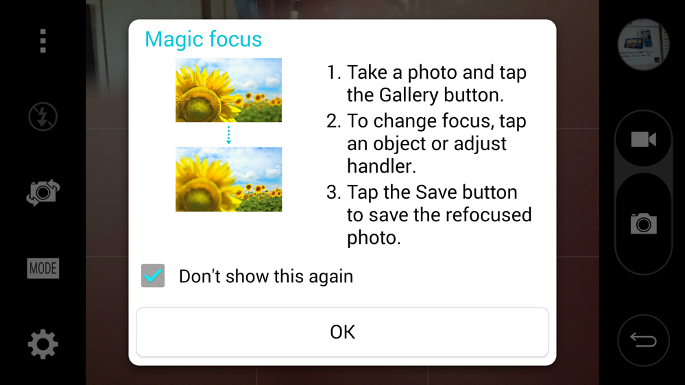When toggled, the camera turns to a tap-to-shoot mode, instead of a tap-to-focus mode. But thanks to the laser built into the rear side of the device, you can still count on taking crisp and well-focused shots, even without tapping on the display.