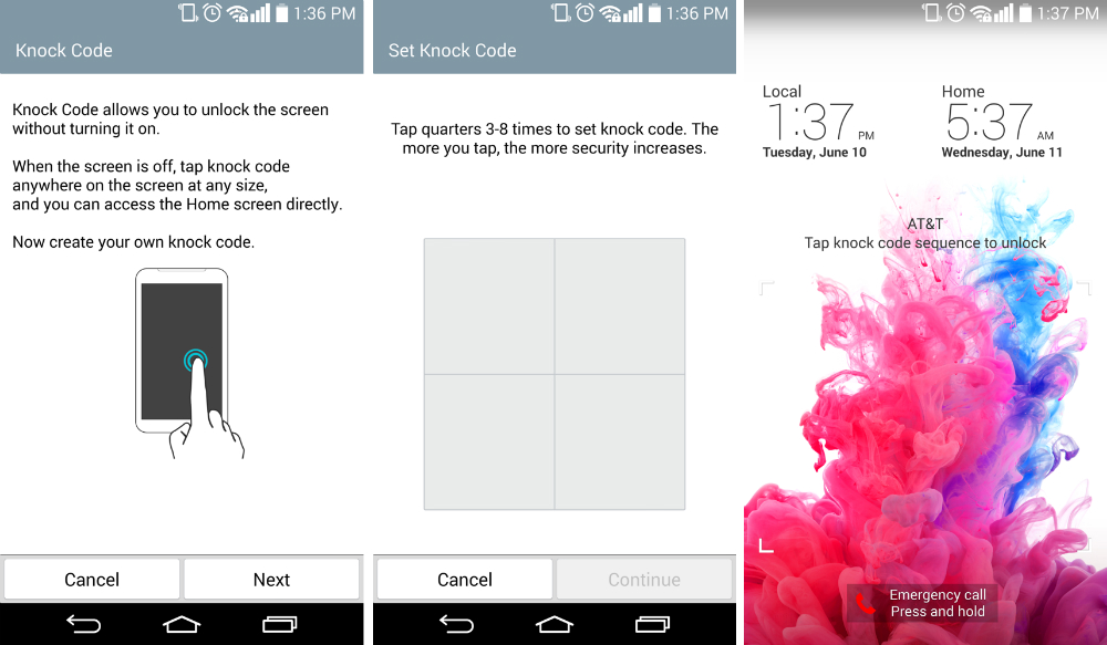 With Knock Code enabled, users can designate a random set of display taps to unlock their device. When setting Knock Code up under the Lock Screen settings menu, there are four quarter areas placed on the screen. Inside those four quarters, you decide what your code will be. For example, you can tap in the top right corner three times, then two times in the lower left corner. The choice is yours.