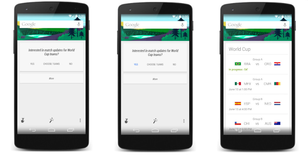 The screenshots including above may look like Google is sharing info on how you can keep up with the World Cup through Google Now. And you know what? They are. But, there is something else that the hypebeasts in the building will have a field day with, and that’s the clock. What does “5:00” in a series of screenshots have to do with anything? Well, if you have been following the Android game at all over the years, quite a bit actually. Is it a hint at Android 5.0? Maybe.