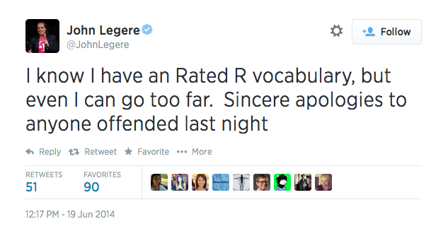 Throughout T-Mobile’s Uncarrer event last night, CEO John Legere acted as he typically does during his company’s press events – like the renegade leader of a scrappy wireless company who holds nothing back when it comes to talking about the practices of his competitors. He can be vulgar and borderline offensive, but up until now, his act has mostly just generated chuckles from media and consumers. Last night, though, some would argue that he took things a little too far. Actually, even he is admitting it.