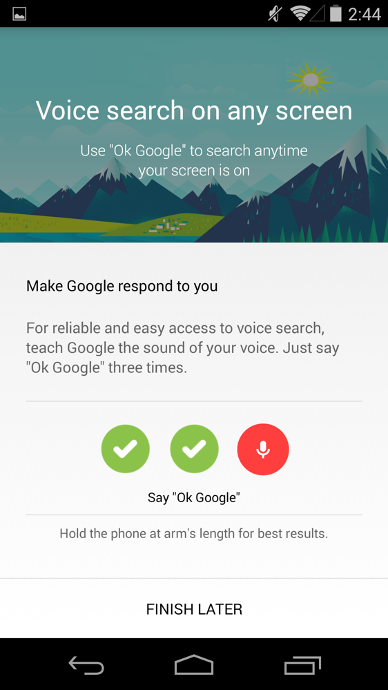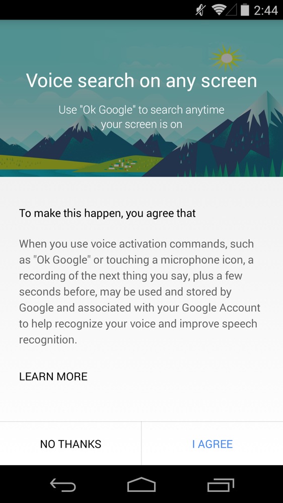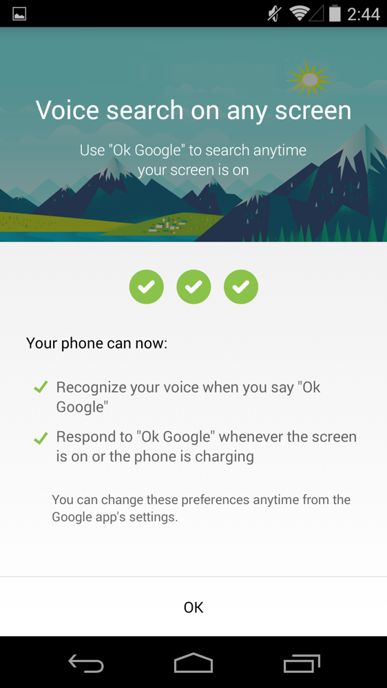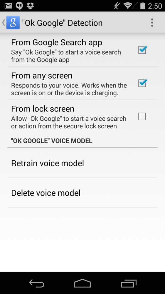 To turn on the new hotword detection, head into Google Now, then scroll to the very bottom, tap Menu>Settings>Voice>”Ok Google” Detection, and then toggle on the options you desire.