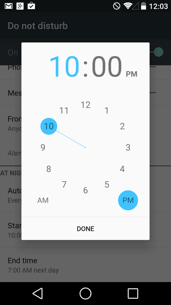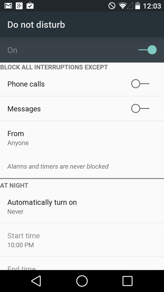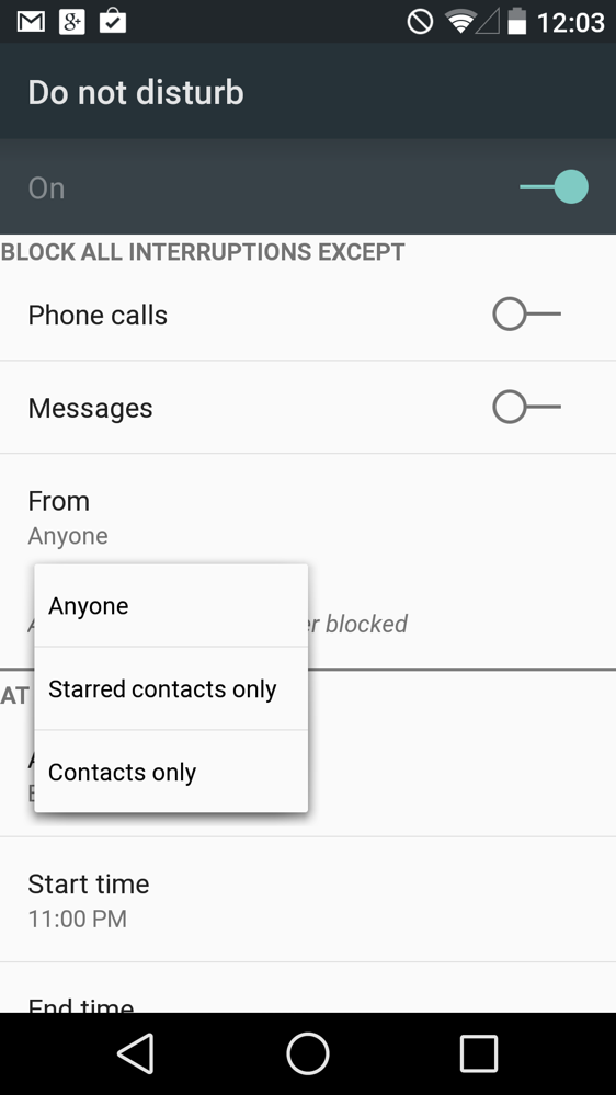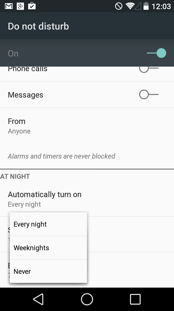 The third and final way to access DND settings, which also happens to give you the most control over this new settings, is through Settings>Sound & Notifications>Do not disturb. Once in this area, you can turn the mode on or off, decide if you want it to block calls or messages or both, decide if sets of contacts can overpower DND (anyone, starred contacts, contacts), and then decide if you want DND to automatically turn itself on during certain hours or days (every night, weeknights, never).