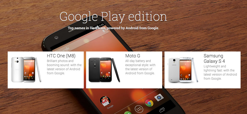 If you head over to the Google Play page for GPE devices, you will notice that only the HTC One (M8), Moto G, and Galaxy S4 are left standing. The Galaxy S4 GPE has been out of stock since June 20, so we aren’t exactly sure why it remains. Chances are that it will be replaced by the Galaxy S5 Google Play Edition before long, assuming that device is still on the way.